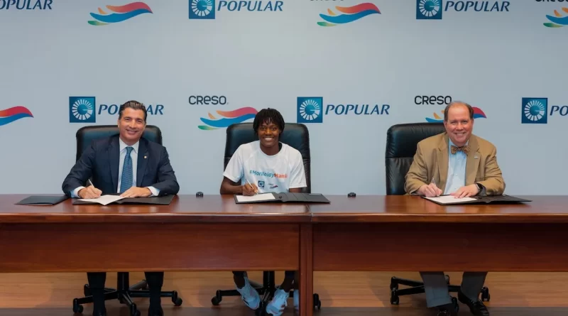 El contrato se firmó en la Torre Popular entre la señora Paulino, el presidente ejecutivo del Popular, señor Christopher Paniagua, y el presidente de CRESO, señor Felipe Vicini, acompañados de ejecutivos de la entidad bancaria.