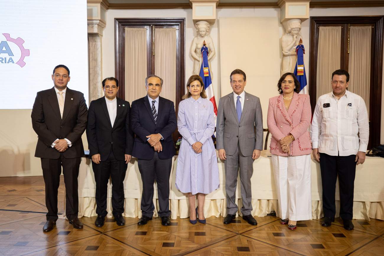Durante la actividad, realizada en el salón Las Cariátides del Palacio Nacional, estuvieron presentes, Celso Juan Marranzini, presidente de la Asociación de Industrias de la República Dominicana (AIRD), Secilio Espinal, rector de la Pontificia Universidad Católica Madre y Maestra (PUCMM), y Alliet Ortega, vicerrectora de Administración y Finanzas del Instituto Tecnológico de Santo Domingo (Intec)