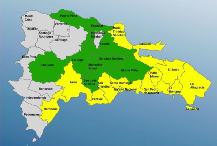 En tanto que en verde están: San Juan, La Vega, Puerto Plata, Espaillat, Monseñor Nouel, Sánchez Ramírez, Monte Plata, Hermanas Mirabal y Duarte.