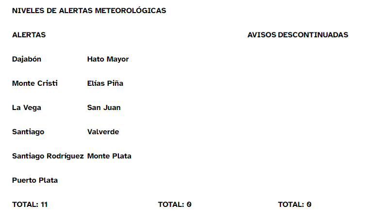 La Onamet mantiene las alertas meteorológicas, productos de las precipitaciones ocurridas y esperadas, ante posibles inundaciones urbanas, crecidas de ríos, arroyos y cañadas, así como, deslizamientos de tierra hacia municipios de las siguientes provincias: