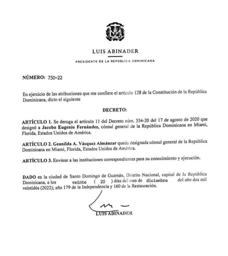 La disposición deroga el artículo 11 del Decreto número 354-20, del 17 de agosto de 2022, que designaba a Jacobo Eugenio Fernández bajo este cargo.