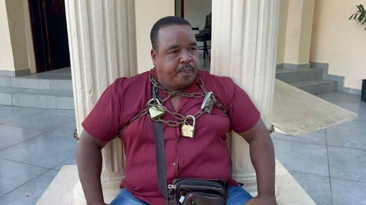 DAJABÓN.- Un comerciante se encadenó este martes en las columnas delanteras de la gobernación provincial de Dajabón, para exigir la devolución de mercancías incautadas por el por miembros del Cuerpo Especializado en Seguridad Fronteriza Terrestre (Cesfront).
